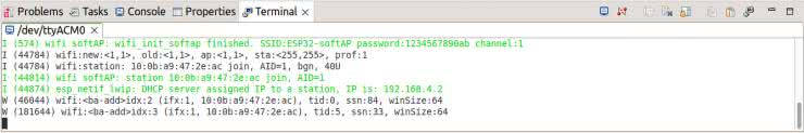 Na rysunku 5 pokazano zrzut ekranu z komunikatami wysyłanymi do terminala przez moduł ESP32 z uruchomionym przykładowym oprogramowaniem. Moduł działa w trybie softAP i tworzy sieć o nazwie „ESP32-softAP” zabezpieczoną hasłem „1234567890ab”. Do sieci podłączona jest jedna stacja, której przydzielono numer IP: 192.168.4.2.
