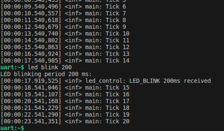 Nie przejmujmy się na razie tym, że zarówno logi, jak i shell używają tego samego portu. Dodajemy nasze własne komendy powłoki Zephyra na końcu pliku led_control.c (jak w listingu 9).