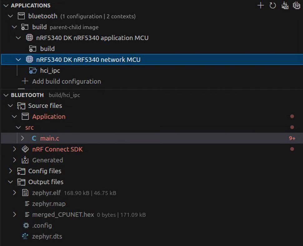 Włączenie opcji CONFIG_BT=y w ustawieniach projektu automatycznie dodaje do projektu budowanie drugiego obrazu, przeznaczonego dla procesora sieciowego, zawierającego wszystkie potrzebne warstwy stosu BLE. W katalogu /build/hci_ipc odnajdziesz wynik budowania projektu na procesor sieciowy.