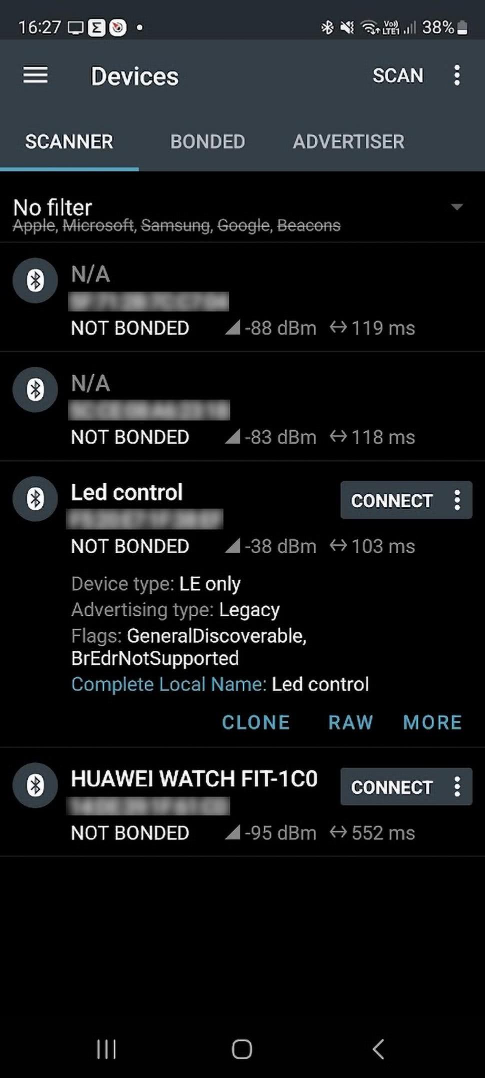 Teraz możesz odnaleźć urządzenie „LED control” w standardowym menu Bluetooth telefonu.