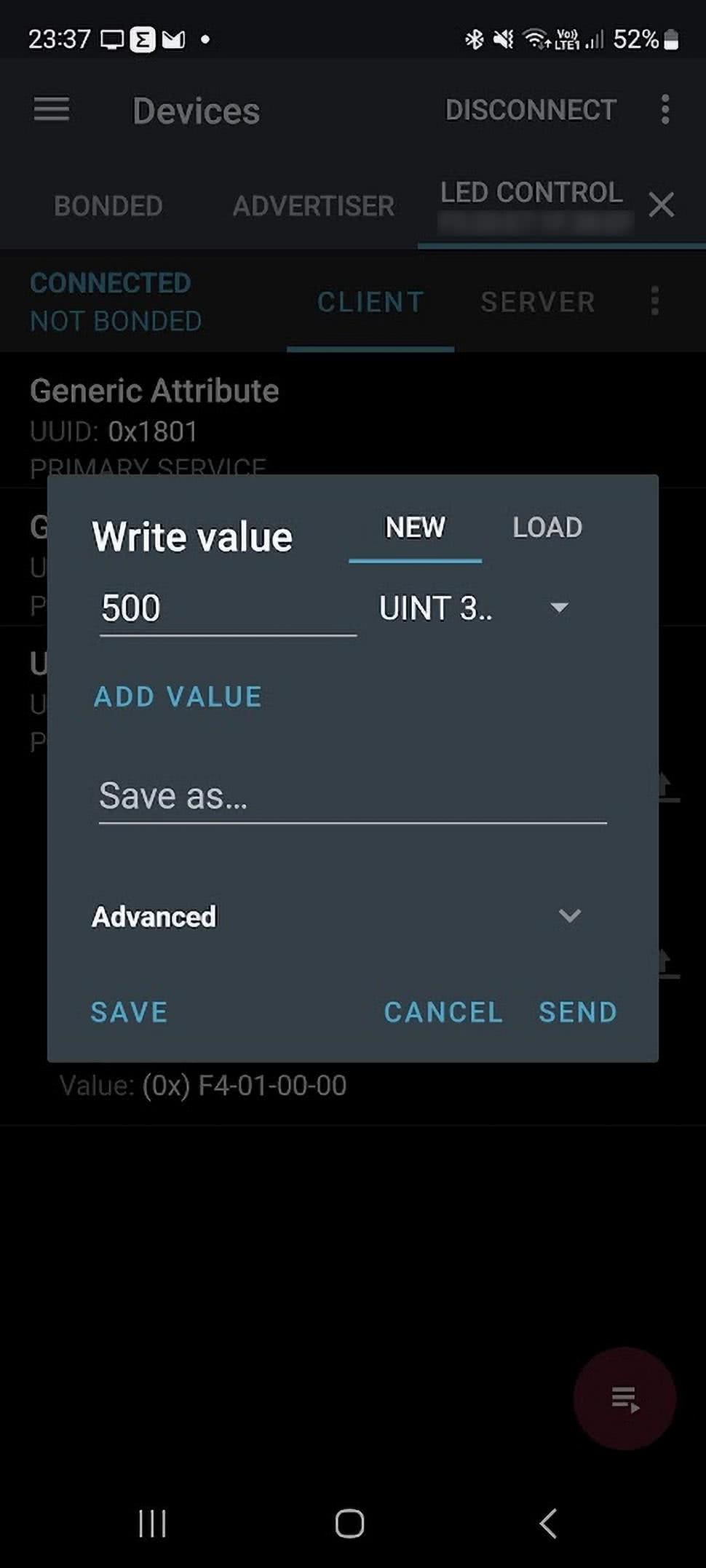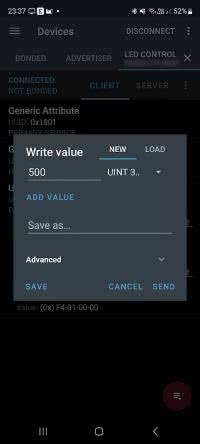 Od teraz, korzystając z aplikacji mobilnej, możemy do naszej charakterystyki o UUID 7c8482f2-1104-44b8-a354-3f5b8488083d wpisać nowy okres migania LED w milisekundach (rysunek 4), pamiętając o wybraniu typu zmiennej jako UINT 32 (Little Endian). Nowa wartość zostanie natychmiast przesłana do naszej płytki, gdzie możemy w czasie rzeczywistym obserwować jej wpływ na zachowanie diody. Przykładowo, po wpisaniu 500, zobaczymy, że nasz LED co sekundę zaświeca się i gaśnie.