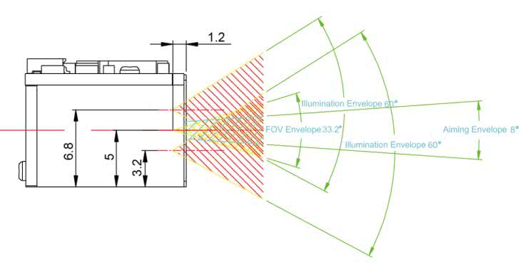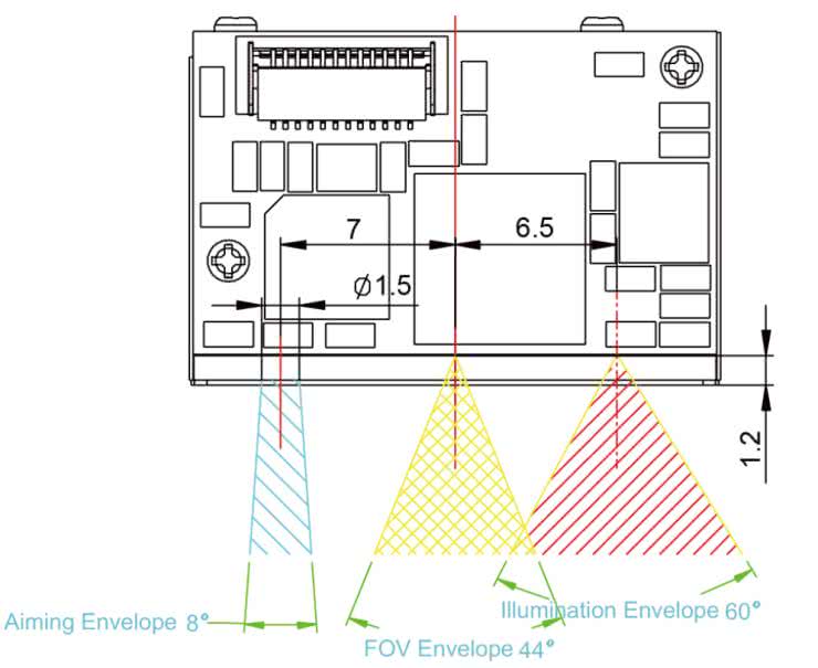 W przypadku umieszczenia modułu w głębokiej wnęce obudowy należy zwrócić szczególną uwagę, by jej brzegi nie kolidowały z wiązkami oświetlacza oraz polem widzenia kamery – stosowne szkice, wykreślone w dwóch ortogonalnych płaszczyznach, można zobaczyć na rysunkach 3 i 4.