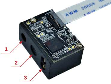 Ułożenie poszczególnych elementów optycznych na panelu czołowym obudowy modułu można zobaczyć na fotografii 2. Silnik skanujący EM3296V4 to rozwiązanie w pełni zintegrowane – wbudowany układ elektroniczny z wydajnym procesorem zapewnia realizację całej procedury odczytu kodów kreskowych i matrycowych, zaś wynikiem działania modułu jest… zdekodowany ciąg znaków, udostępniany za pośrednictwem jednego z dwóch interfejsów szeregowych.
