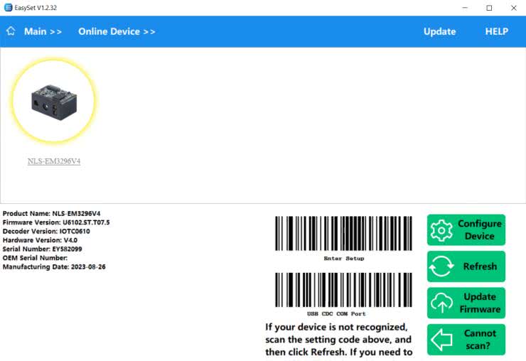 Konstruktorzy implementujący skaner EM3296V4 (lub jeden z wielu innych silników tego samego producenta) we własnym projekcie mają możliwość konfiguracji modułu za pomocą oprogramowania EasySet, dostępnego na komputery z systemem Windows. Po zainstalowaniu i uruchomieniu programu pojawia się okno startowe (rysunek 7), w którym można wybrać jedną z czterech opcji – nas interesuje w tym momencie programowanie ustawień skanera przez kabel USB, wybierzmy więc opcję Online Device.