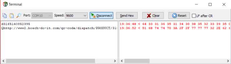Jeżeli pracujemy w trybie USB CDC lub używamy interfejsu UART, to dane wyjściowe generowane przez moduł możemy podejrzeć w dowolnym oprogramowaniu terminalowym (np. PuTTY w przypadku systemu Windows, czy też moserial w systemach linuksowych). Jak widać na rysunku 11, dane są domyślnie oddzielane znakami nowej linii, zaś ewentualny prefiks oznaczający rodzaj zeskanowanego kodu jest „doklejany” bezpośrednio przed właściwym ciągiem znaków.