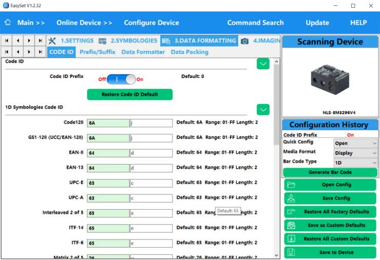 - Rodzaje odczytywanych kodów 1D: Code 39, Code 128, UCC/EAN-128, AIM128, EAN-8, EAN-13, ISBN/ISSN, UPC-E, UPC-A, Interleaved 2 of 5, ITF-6, ITF-4, Matrix 2 of 5, Industrial 25, Standard 25, Codabar, Code 11, Plessey, MSI-Plessey, GS1-DataBarTM(RSS), RSS-14, RSS-Limited, RSS-Expand.