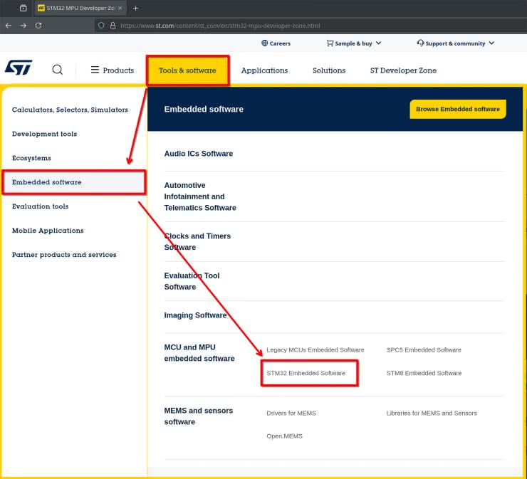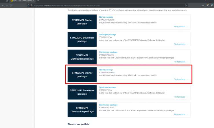 W tym momencie pozostaje nam już tylko pobranie i wgranie systemu operacyjnego z strony https://st.com. Na rysunkach 2...5 zaprezentowano ścieżkę poruszania się po stronie st.com w celu zlokalizowania interesującego nas pliku. W przypadku chęci wgrania systemu operacyjnego na płytkę STM32MP2 należy wybrać odpowiedni dla niej pakiet instalacyjny. Dalsze kroki pozostają już takie same jak dla STM32MP1. Pobrany plik należy rozpakować do dowolnego folderu – ważne, by przed wykonaniem operacji był on pusty.