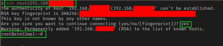 Po poprawnym nawiązaniu połączenia uzyskamy zdalny dostęp do terminalu linuksowego na płytce z poziomu komputera.