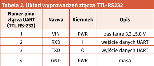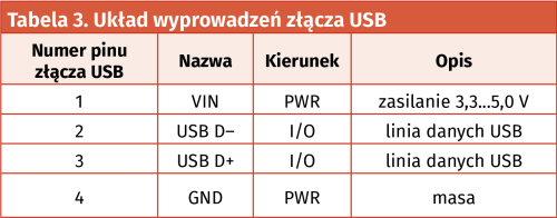 Pierwsze z nich – znajdujące się obok złącza ZIF – pozwala skorzystać z interfejsu RS-232 (tabela 2), zaś drugie (zamontowane na prostopadłym boku płytki drukowanej) udostępnia szynę USB (tabela 3).
