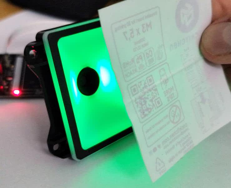 W tym miejscu należy dodać, że dyfuzor skanera EM20-80 V2 pełni także dodatkową funkcję – rozprasza bowiem światło zielonych diod LED, które sygnalizują dokonanie prawidłowego odczytu zaprezentowanego skanerowi kodu (fotografia 7). Jeżeli jednak szczególnie zależy nam na takim potwierdzeniu wizualnym, to zdecydowanie warto ustawić odpowiednio długi czas działania zielonych LED-ów – domyślnie wybrany czas (20 ms) jest bowiem na tyle krótki, że impuls w praktyce pozostaje niemal niezauważalny w typowych warunkach pracy. Nie jest to jednak żaden problem – oprogramowanie skanera umożliwia ustawienie dowolnej wartości z przedziału od 1 ms do 2500 ms – praktyczne testy wykazały, że optymalny czas załączenia diod zawiera się w przedziale od 300 ms do ok. 1 sekundy.