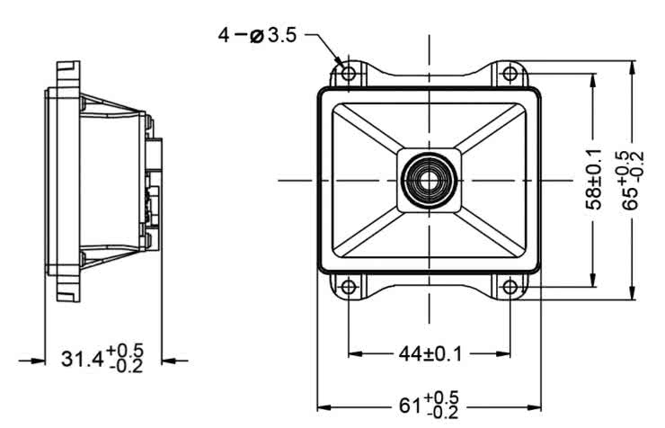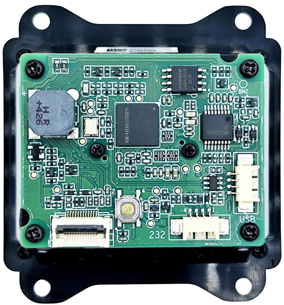 Moduł EM20-80 V2 jest zbudowany w oparciu o prostą (a dzięki temu niezawodną) konstrukcję mechaniczną – główna płytka drukowana, widoczna na fotografii 2, jest przykręcona do korpusu wykonanego z czarnego tworzywa sztucznego. Do płytki zamocowano także samą kamerę, której obiektyw został wyprowadzony w środkowej części dyfuzora, wytworzonego z mlecznobiałego tworzywa. Na jego zewnętrznym obwodzie umieszczono dodatkowo miękką uszczelkę – w trakcie integracji docelowego systemu należy tak zamontować silnik skanujący, by uszczelka pozostawała bezpośrednio dociśnięta do okna optycznego – pozwoli to uniknąć jakichkolwiek niepożądanych odbić wewnętrznych oraz akumulacji zanieczyszczeń (kurzu, wilgoci czy małych owadów, mogących dostać się do wnętrza obudowy urządzenia). Do zamocowania modułu w docelowej obudowie przewidziano cztery otwory montażowe, rozmieszczone symetrycznie na wystających uszach i przystosowane do użycia ze śrubami M3 lub podobnymi. Rysunek 2 prezentuje najważniejsze wymiary zewnętrzne czytnika.