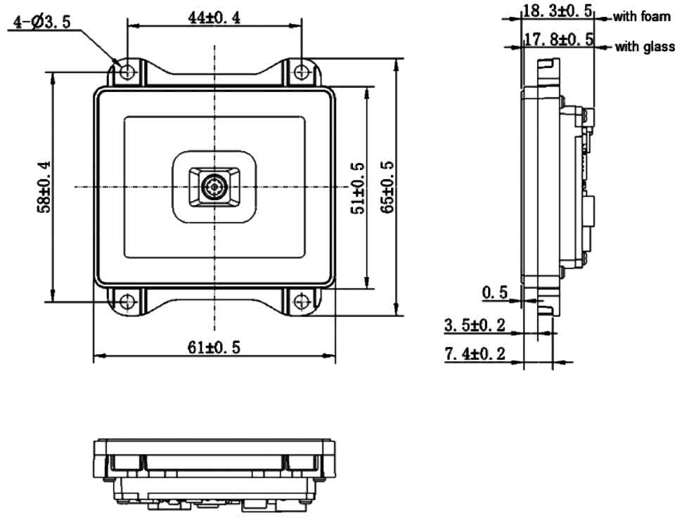Najważniejsze wymiary modułu pokazano na rysunku 1. Grubość całości, w zależności od wersji (określonej przez obecność fabrycznie zamontowanego, szklanego okna optycznego) waha się od 17,8 do 18,3 mm, mamy więc do czynienia z modułem bardzo kompaktowym, o małej głębokości instalacyjnej, co ma szczególne znaczenie w mniejszych urządzeniach. Rozstaw czterech otworów montażowych o średnicy 3,5 mm wnosi 44×58 mm. Co bardzo ważne, producent zmyślnie cofnął „uszy” przeznaczone do mocowania czytnika o 3,5 mm od czoła obudowy, dzięki czemu wkomponowanie go w obudowę docelowej konstrukcji i ukrycie łbów śrub mocujących jest nieporównanie łatwiejsze, niż w przypadku niektórych innych modułów OEM, np. wyświetlaczy, w których mocowania niemalże licują z samym ekranem.