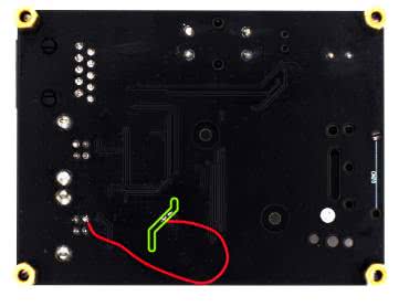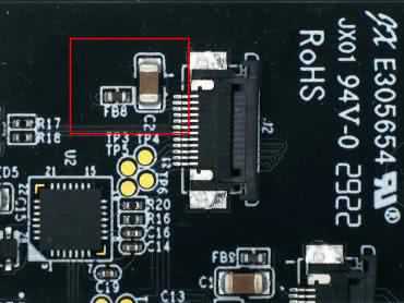 Ścieżka ta, dość szeroka, jest łatwa do odnalezienia – przechodzi bowiem (otoczona obszernym polem masy) na warstwie dolnej płytki drukowanej. Po upewnieniu się, że faktycznie jest to poszukiwana linia zasilania, wystarczyło wykonać w ścieżce niewielką przerwę, zdrapać fragment soldermaski (fotografia 3), a następnie połączyć odcinek idący do złącza J2 z pinem VBUS skrajnego gniazda USB o oznaczeniu J4. Tak przerobiona płytka ewaluacyjna z powodzeniem nadaje się do uruchomienia modułu EM20-85, jeżeli nie mamy akurat lepszego sposobu, a nie chcemy inwestować czasu i/lub środków finansowych w produkowanie dedykowanego adaptera ze złączem ZIF.