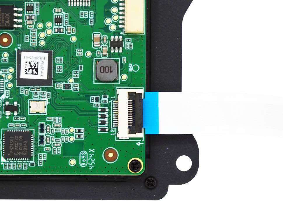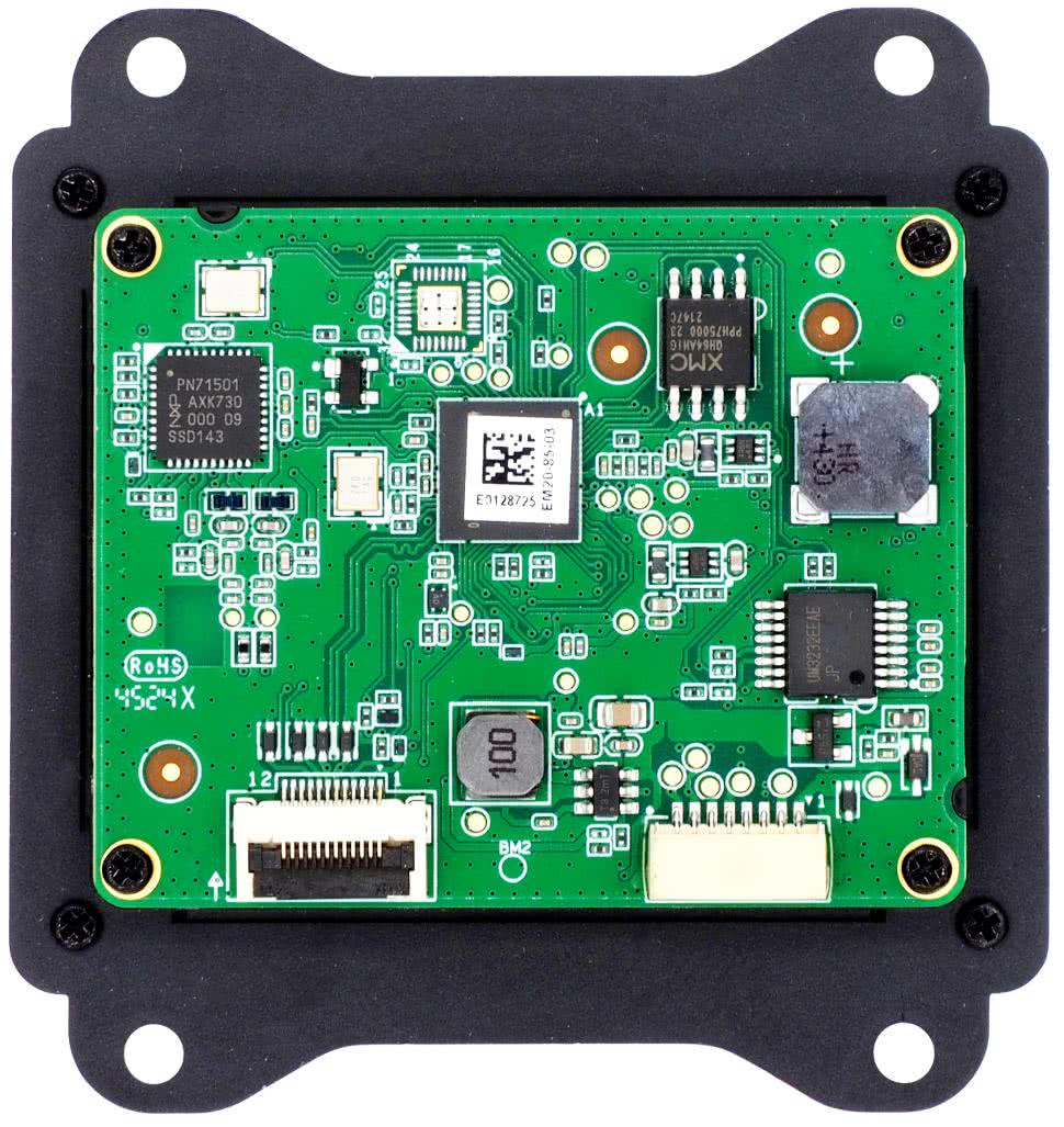 Widok modułu od strony okna optycznego pokazano na fotografii tytułowej, zaś fotografia 1 prezentuje płytkę drukowaną zamontowaną od tyłu obudowy czytnika. Przy jej dolnej krawędzi znajdują się dwa złącza: 12-pinowe gniazdo FPC oraz dodatkowe, 8-pinowe gniazdo rastrowe. W pobliżu prawego górnego rogu PCB znalazł się niewielki, ale dość głośny buzzer SMD, dzięki któremu projektant docelowego urządzenia może zrezygnować z instalacji dodatkowego sygnalizatora akustycznego i skorzystać jedynie z linii zasilania oraz komunikacyjnych (UART lub USB).