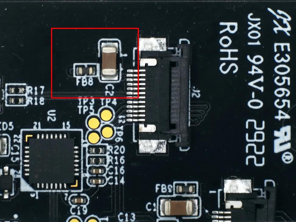 W czasie opracowywania niniejszego artykułu autor nie miał pod ręką ani zestawu ewaluacyjnego w pełni kompatybilnego z opisywanym modułem, ani gotowego kabla z wtykiem RJ45. Aby móc wygodnie przeprowadzić testy modułu, nie rezygnując z funkcjonalności oferowanych przez EVK (przycisk wyzwalania skanu, dioda LED good read), autor artykułu zdecydował się na krok być może dość drastyczny, ale skuteczny: wystarczyło bowiem zmodyfikować nieco płytkę EVK3030. W tym celu należało zidentyfikować ścieżkę zasilania idącą od stabilizatora 3,3 V do kondensatorów odsprzęgających przy złączu ZIF J2 (fotografia 2).