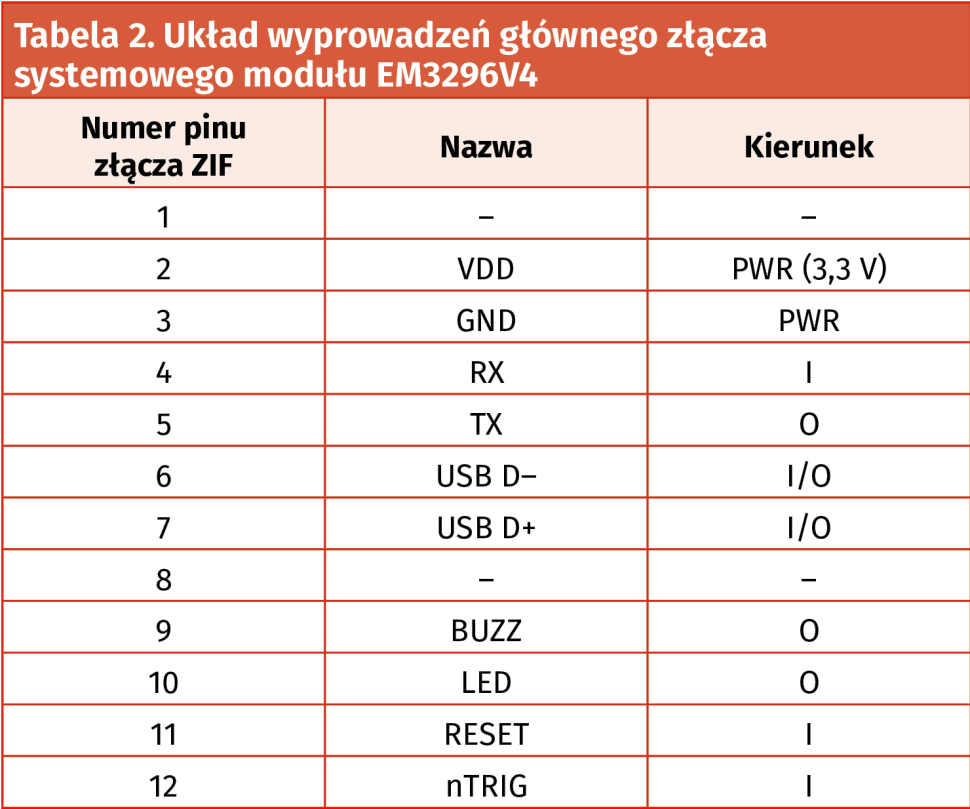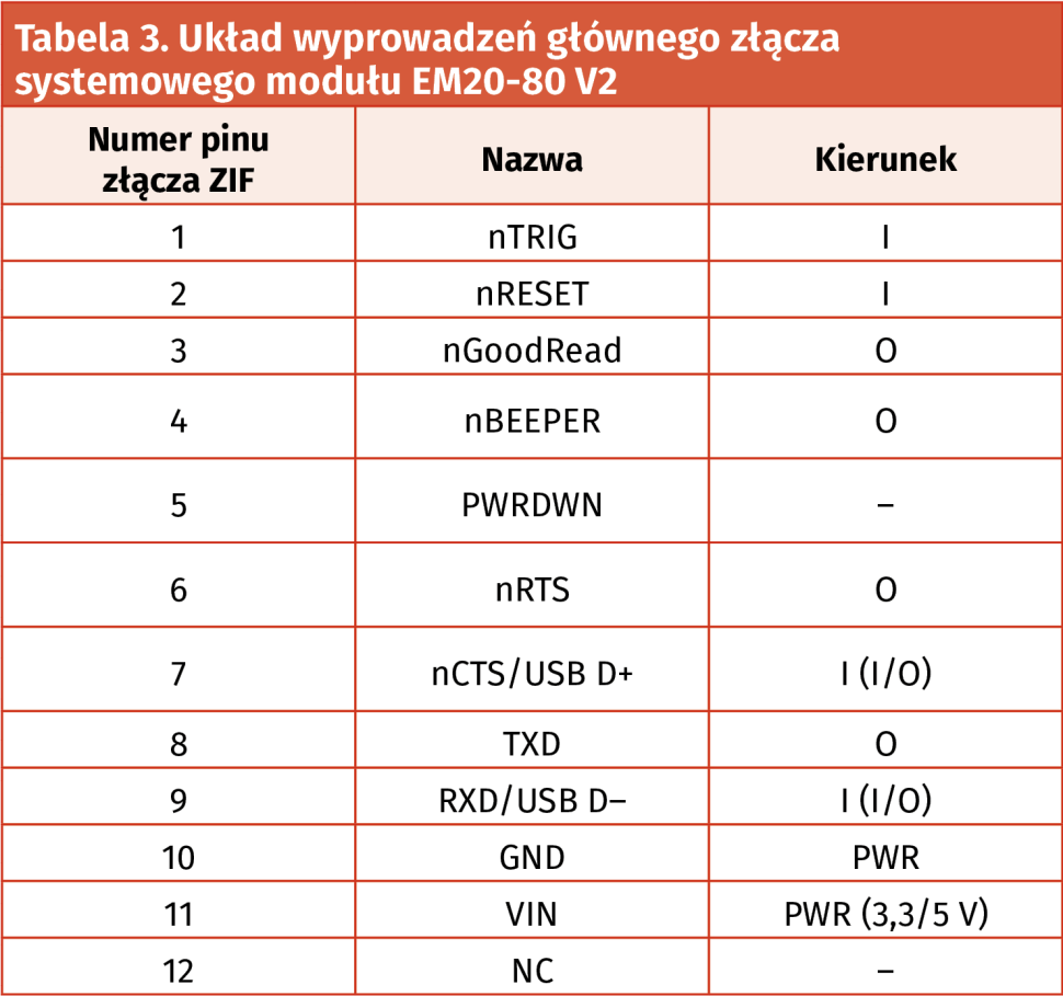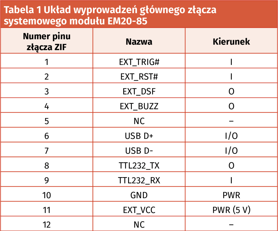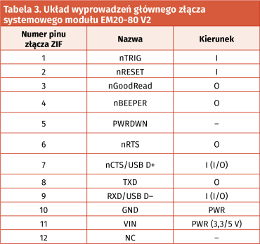 Jak już wspomnieliśmy na początku artykułu, moduł EM20-85 zasadniczo różni się od opisanych wcześniej czytników OEM pod względem implementacji w docelowym urządzeniu. Główna różnica – z punktu widzenia projektanta elektroniki – leży w przyporządkowaniu wyprowadzeń złącza systemowego (12-pinowego gniazda ZIF) oraz obsługiwanym napięciu zasilania. Dla lepszego obrazu porównajmy zatem „pinologię” naszego głównego bohatera (tabela 1) z układami wyprowadzeń modułów EM3296V4 (tabela 2) oraz EM20-80 V4 (tabela 3).