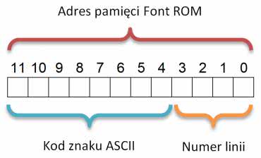 gdzie KodASCII to numer znaku od 0 do 255. Jednak wcale nie musimy wykonywać żadnego mnożenia! W FPGA operacje mnożenia i dzielanie na liczbach będących potęgami dwójki to de facto... przestawianie bitów. Popatrz na rysunek 4, który ilustruje skład informacji doprowadzanych do wejścia pamięci ROM czcionki. Skoro mamy 256 znaków w pamięci, to potrzebujemy 8 bitów, by zapisać tę liczbę (28=256) – umieszczamy je na bardziej znaczących pozycjach, a numer jednej z szesnastu linii bitmapy czcionki umieszczamy na czterech młodszych bitach. W ten sposób powstaje nam 12-bitowy adres w pamięci.
