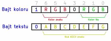 Najstarszy bit z przesyłanego bajtu decyduje o znaczeniu pozostałych bitów. Zero oznacza, że pozostałe bity [6:0] to kod ASCII znaku do wyświetlenia, zaś jedynka na tej pozycji – że bity [6:4] to kolor znaku, a pole [2:0] to kolor tła.