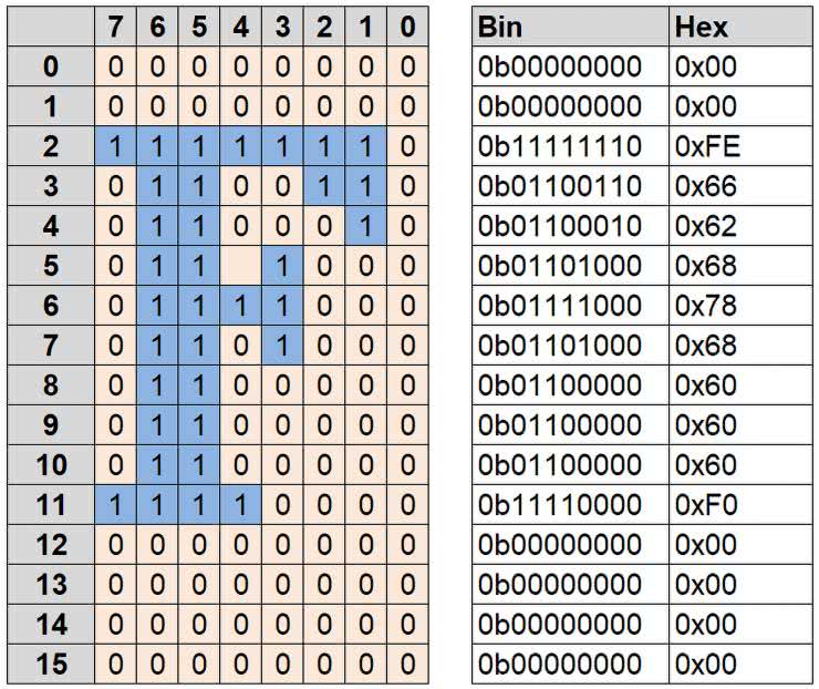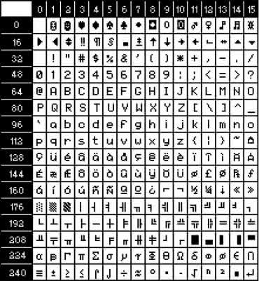 Cały znak tworzy 16 bajtów i ta liczba również nie jest przypadkowa – wszak to czwarta potęga dwójki (24=16), a 16 kombinacji możemy zapisać na czterech bitach. Każdy symbol ma swój adres w pamięci, a ponieważ każdy z nich wykorzystuje dokładnie 16 bajtów, adres początku znaku (tzn. zerowego bajtu znaku) możemy bardzo łatwo obliczyć wzorem