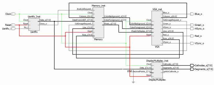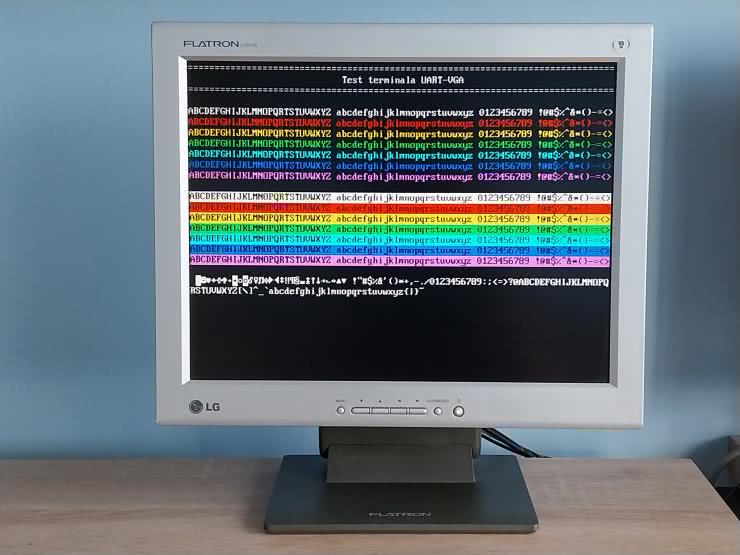Po odebraniu bajtu tekstu przez interfejs UART odpowiadający mu znak ma zostać natychmiast wyświetlony na ekranie, na pozycji aktualnie wskazywanej przez kursor, po czym kursor zostaje przesunięty o jedną pozycję w prawo lub na początek kolejnej linii. Domyślnie terminal będzie wyświetlał białe znaki na czarnym tle. Odebranie bajtu koloru spowoduje zapisanie do rejestru kolorów nowych ustawień i będą one dotyczyły kolejnych odebranych bajtów tekstu – tak długo, aż zostanie przesłany kolejny znak koloru.