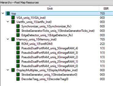212=4096 – potrzebujemy więc czterech bloków EBR, aby móc pomieścić całą czcionkę. Jednak jest z tym pewien problem… pozostały nam tylko dwa bloki do dyspozycji. No cóż, albo weźmiemy układ FPGA o większej pamięci, albo obetniemy plik czcionki i zadowolimy się znakami od 0 do 127, czyli wszystkimi literami, cyframi, interpunkcją, znakami kontrolnymi i niektórymi znakami diakrytycznymi. Wybrałem tę drugą opcję, czyli 5 bloków EBR przeznaczyłem na pamięć RAM tekstu i koloru, a 2 bloki EBR będą funkcjonować jako pamięć ROM czcionki. Kody znaków ASCII będą nie 8-bitowe, jak to zwykle bywa, lecz tylko 7-bitowe.