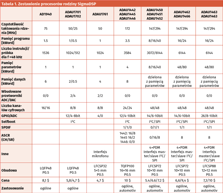 Obecnie oferta SigmaDSP składa się z kilkunastu układów należących do kilku rodzin. Zestawienie wybranych procesorów, wraz z porównaniem najważniejszych parametrów, zaprezentowano w tabeli 1.