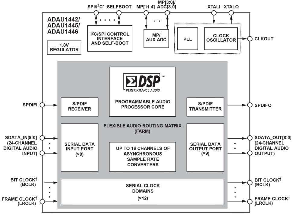 Popularnym wyborem, ale delikatnie ustępującym najnowszym rozwiązaniom, są układy z serii ADAU144x. Strukturę wewnętrzną ADAU144x pokazano na rysunku 2. Układy pozbawione są wbudowanych przetworników AD/DA, obsługują jednak tryb autonomiczny Selfboot oraz oferują rozbudowany interfejs GPIO z przetwornikiem AD o rozdzielczości zwiększonej do 10 bitów. Procesory z omawianej rodziny wyposażone są w zwiększoną pamięć i taktowany szybszym zegarem rdzeń DSP o podwyższonej wydajności, a struktura uzupełniona jest dodatkowo w sprzętowy układ wielokanałowego konwertera częstotliwości próbkowania ASRC (zależnie od układu: w ADAU1442 – 16 kanałów, 8 domen zegarowych, zaś w ADAU1445 – 16 kanałów, 2 domeny zegarowe; najtańszy ADAU1446 pozbawiony jest bloku ASRC). Blok ASRC umożliwia bezpośrednią współpracę ze źródłami audio o różnych częstotliwościach próbkowania, a krosownica sygnału FARM umożliwia elastyczne konfigurowanie sygnałów z różnych domen zegarowych. Istotnym wyposażeniem układów jest wbudowany, kompletny odbiornik i nadajnik sygnału w standardzie SPDIF (96 kHz), eliminujący konieczność zastosowania zewnętrznych układów WM/CS/DIX blokujących zasoby interfejsów cyfrowych DSP (należy pamiętać, że model ADAU1446 jest pozbawiony bloku SPDIF). Układy ADAU144x mają także konfigurowalny sprzętowo, buforowany generator sygnału zegarowego, ułatwiający współpracę z układami wymagającymi sygnału MCLK (np. z przetwornikami DAC).