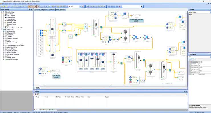 Rozpoczęcie pracy z SigmaDSP – podobnie jak z każdym innym procesorem – wymaga jedynie (!) zestawu uruchomieniowego z programatorem/debuggerem oraz czasu na zapoznanie się z dokumentacją układu i środowiska programistycznego. Zastosowane przez Analog Devices podejście oparte na „graficznym programowaniu” procesorów przy użyciu środowiska narzędziowego SigmaStudio zapewnia w pełni intuicyjne tworzenie aplikacji DSP. Proces przebiega w sposób identyczny do rysowania schematu blokowego, odzwierciedlającego przepływ rzeczywistego sygnału audio, a w większości przypadków polega wręcz na zestawianiu połączeń pomiędzy urządzeniami – takimi jak miksery, filtry, korektory, kompresory, ograniczniki – dokładnie tak, jak ma to miejsce podczas konfiguracji fizycznego systemu audio. „Program” rysowany jest z dostarczonych przez producenta, udokumentowanych (mniej lub bardziej szczegółowo) i sprawdzonych bloków funkcjonalnych, od najprostszych (typu sumowanie sygnału), aż do złożonych (typu Pitch Transposer, Noise Cancelling lub Beam Forming). Po połączeniu bloków w aplikację wystarczy załadować wynik kompilacji do procesora i… gotowe.