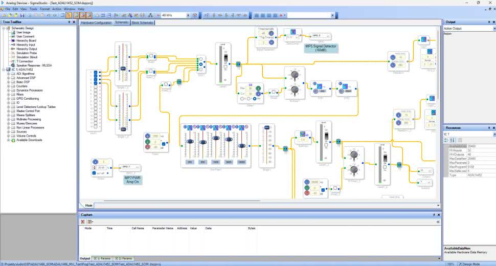Każdy z opisanych procesorów współpracuje z środowiskiem SigmaStudio (rysunek 4), co jest najważniejszą cechą układów i jednocześnie ich największym atutem. Oprogramowanie narzędziowe SigmaStudio (aktualna wersja 4.7) jest udostępnione za darmo, wymaga jedynie rejestracji na stronie producenta. Jak wspominałem wcześniej, jest to środowisko graficzne, w którym „rysujemy” schemat z gotowych, parametryzowanych bloków funkcjonalnych. Zwalnia to programistę z konieczności żmudnego opanowywania asemblera DSP i zagłębiania się w tony dokumentacji. Dzięki niewielkiemu nakładowi sił potrzebnych na opanowanie „programowania” SigmaDSP, możliwa jest realizacja nawet złożonych, jednostkowych projektów, w bardzo krótkim czasie.