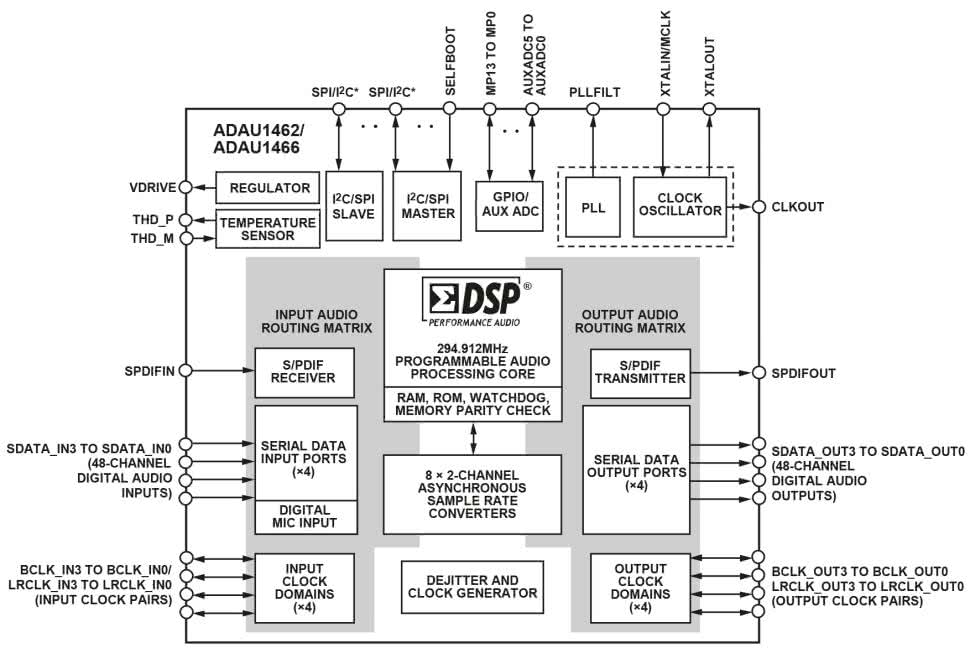 Rodziny: ADAU145x oraz jej rozbudowana kontynuacja ADAU146x, ze względu na wspólne cechy, mogą zostać omówione razem. Podstawowe cechy okazują się identyczne, a same procesory są zamienne w „górę”, podobnie jak rodzina ADAU144x. Strukturę wewnętrzną ADAU146x zaprezentowano na rysunku 3. Najważniejszą jej cechą jest rozbudowana pamięć i dwukrotnie zwiększona wydajność. W zależności od potrzeb można dobrać układ „pełnowymiarowy” bądź dostępny w wersji ekonomicznej (z mniejszym rozmiarem pamięci, niższym taktowaniem rdzenia i okrojonym blokiem ASRC/SPDIF). Układy ADAU145x/6x także pozbawione są przetworników AD/DA. Interfejs cyfrowy rozszerzony został do 48 kanałów, nieporównywalnie większa jest też elastyczność konfiguracji trybów pracy, co zwększa zakres możliwych do zastosowania przetworników AD/DA. Istotną zmianą jest rozbudowa interfejsu komunikacyjnego SPI/I²C, który w ADAU145x/146x rozdzielony został na osobne interfejsy master i slave. Umożliwia to nie tylko komunikację z DSP w celu konfiguracji lub obsługi trybu Selfboot, ale także (w trybie master) konfigurację współpracujących układów, np. przetworników AD/DA lub współpracę z zewnętrzną pamięcią SPI RAM/Flash bezpośrednio przez procesor DSP (np. w celu uzyskania bardzo długich opóźnień cyfrowych sygnału).