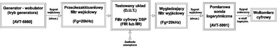 Rysunek 61 prezentuje schemat blokowy zastosowanego toru pomiarowego. Platformę sprzętową do testów, której sercem jest mikrokontroler STM32L432KC, osadzony na 30-pinowym module NUCLEO-STM32L432KC [6, 7, 8], zrealizowano wg niemal identycznej koncepcji, jak to miało miejsce w przypadku testów filtrów FIR i dlatego nie będzie ona tutaj szerzej omawiana. W szczególności zastosowano te same analogowe filtry: wejściowy i wyjściowy. Natomiast jedyną (ale istotną) różnicą było użycie innego ustroju pomiarowego, a mianowicie prosty oscyloskop cyfrowy o stosunkowo niskiej, 8-bitowej rozdzielczości przetwornika ADC (a – w konsekwencji – oferującego niską dokładność przetwarzania) służył jedynie do kontroli obecności i kształtu sygnału wyjściowego. Jako zasadniczy przyrząd pomiarowy zastosowano sondę logarytmiczną o dużej dynamice przetwarzania wg projektu AVT5991 [9] oraz półautomatyczny woltomierz cyfrowy. Sonda została uprzednio skalibrowana i wyskalowana tak, że przy napięciu wejściowym sinusoidalnym Uwe=1 Vp-p o częstotliwości F=1 kHz, przetworzone logarytmicznie napięcie stałe na wyjściu sondy wynosiło Uwy=2,2 V. Dodatkowo zmiana zmiennego napięcia wejściowego Uwe o 1 dB skutkowała zmianą stałego napięcia wyjściowego Uwy o 10 mV (czyli współczynnik przetwarzania sondy wynosił 10 mV/dB). Ostatecznie zastosowanie w pomiarach półprofesjonalnej sondy logarytmicznej zaowocowało znacznym zwiększeniem dynamiki i dokładności realizowanych pomiarów.