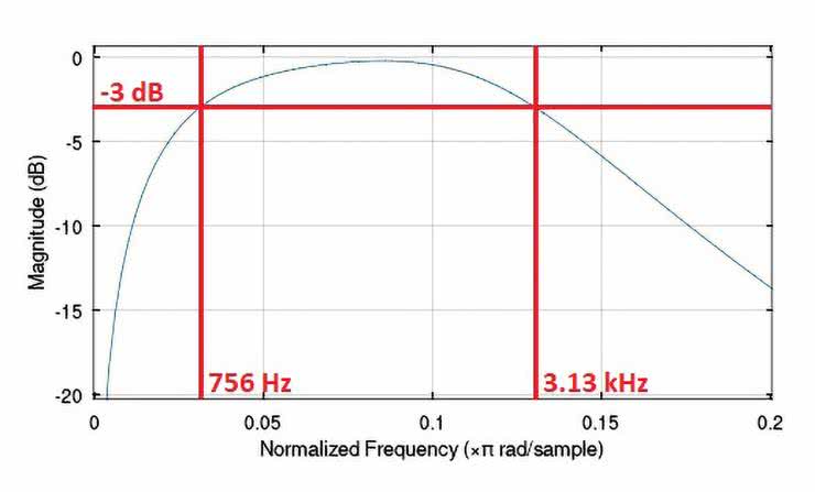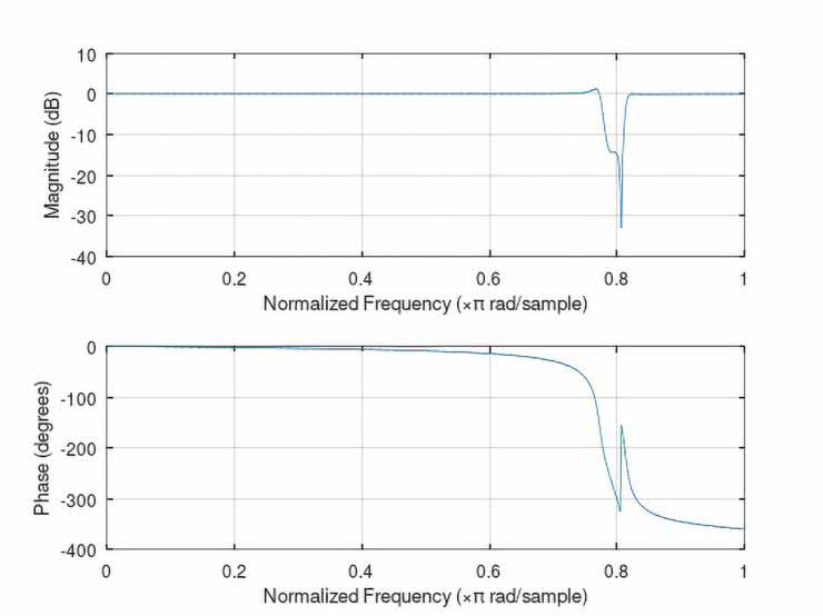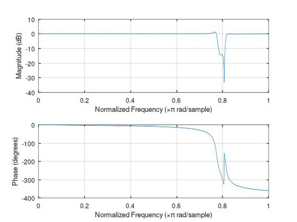 Parametry: Wc, Wl i Wh stanowią wartości częstotliwości granicznych (0…1), wyrażonych względem połowy częstotliwości próbkowania Fs/2. W przypadku prostych filtrów LPF oraz HPF (parametryzowanych odpowiednio jako: low oraz high) wykorzystuje się wyłącznie jeden parametr Wc, natomiast w implementacjach bardziej złożonych filtrów BPF, peak oraz notch (parametryzowanych odpowiednio jako: bandpass oraz stop) – stosuje się obligatoryjnie dwa parametry: Wl i Wh, przy czym obowiązkowo musi zachodzić warunek: Wl < Wh. Do wygenerowania tutaj filtru typu notch zastosowano model parametryzacji typu bandpass z odpowiednio wąskim przedziałem zadanych częstotliwości. Funkcja butter(…) generuje filtry wg tzw. aproksymacji Butterwortha, czyli maksymalnie płaskie. Nie oferuje ona co prawda tak dużej stromości zboczy, jak np. aproksymacja Bessela czy Czebyszewa, jednak minimalizuje zafalowania pasma przenoszenia generowanych filtrów.