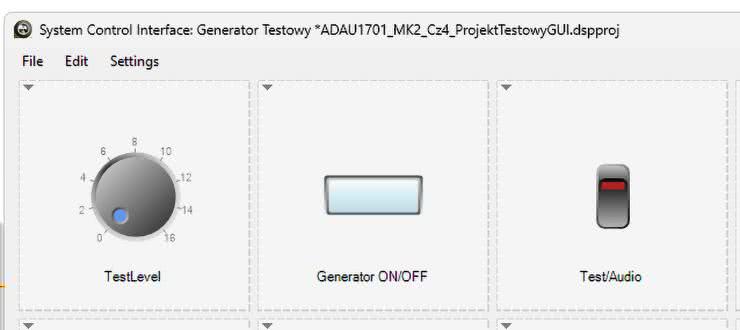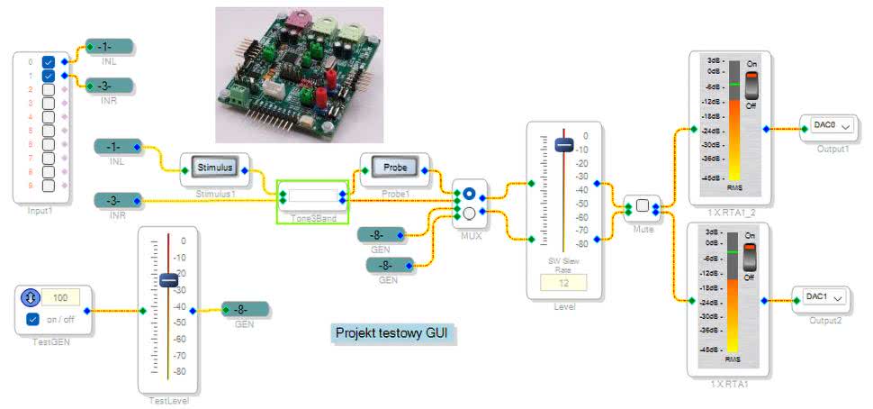 Przykładem praktycznego wykorzystania drugiej metody parametryzacji z zastosowaniem graficznego interfejsu użytkownika będzie projekt testowy ADAU1701_MK2_Cz4_ProjektTestowyGUI. Jest to prosty tor audio z regulacją poziomu, wyciszaniem oraz trójpasmowym regulatorem barwy dźwięku, zawierający generator sygnału testowego, którego schemat pokazano na rysunku 1. Schemat uzupełniono o mierniki poziomu sygnału oraz bloki Stimuls/Probe, umożliwiające wizualizację obliczonej charakterystyki przenoszenia, przydatnej do sprawdzenia działania manipulatorów.
