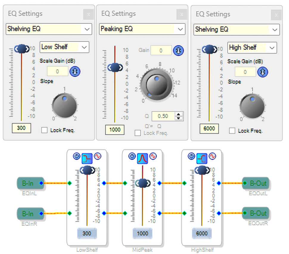 W celu zwiększenia czytelności schematu regulator barwy Tone3Band narysowany został z użyciem schematu hierarchicznego. Schemat bloku wraz z konfiguracją zaprezentowano na rysunku 2. Korektory niskich i wysokich częstotliwości ustawione są jako „półkowe”, co odpowiada klasycznej regulacji barwy tonów niskich i wysokich, w której regulowany jest poziom pasma poniżej lub powyżej ustalonej częstotliwości. Regulator tonów średnich ma natomiast postać klasycznego regulatora podbijającego/osłabiającego wybraną częstotliwość.