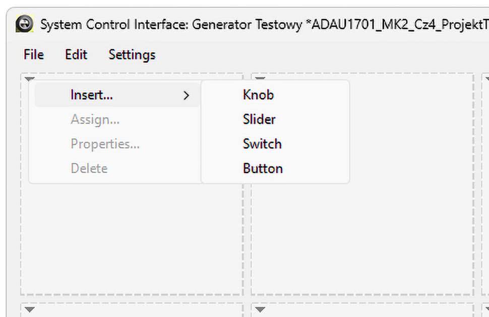 Każde z pól może zostać przypisane do jednego z czterech elementów manipulacyjnych, takich jak: pokrętło (Knob), suwak (Slider), przełącznik (Switch), przycisk (Button), zgodnie z rysunkiem 6. W celu dodania manipulatora wybieramy menu podręczne, dostępne po naciśnięciu małego trójkącika w górnym lewym narożniku danego pola.