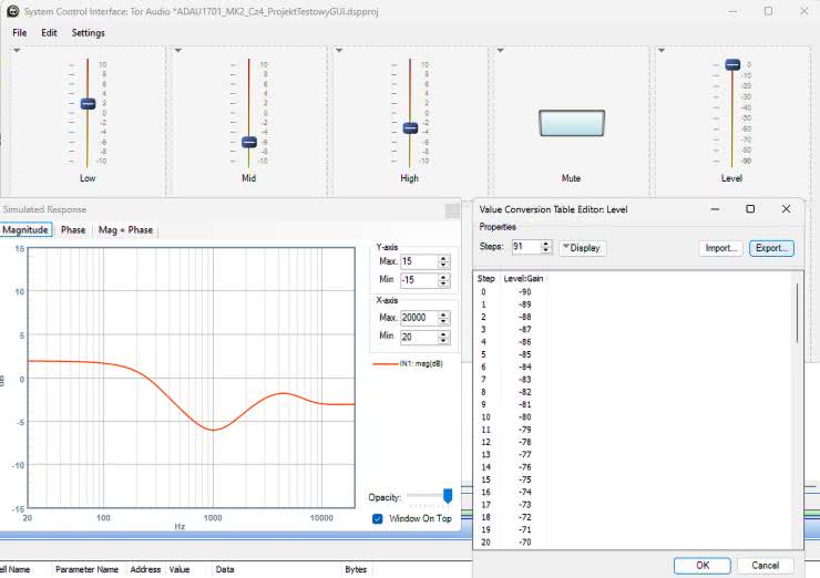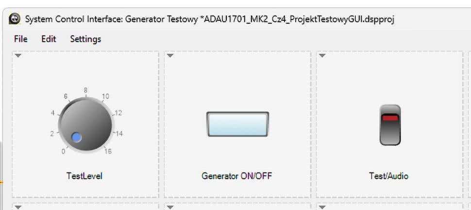 W identyczny sposób należy skonfigurować drugi interfejs, odpowiedzialny za regulację toru analogowego, w skład którego wchodzą trzy suwaki regulatora barwy tonu, przycisk wyciszania i suwak regulacji głośności. Sterowaniu podlegają parametry Boost bloków Main.Tone3Band LowShelf, MidPeak, HighShelf oraz Mute bloku Mute i Gain bloku Level. W przypadku tego ostatniego bloku, w celu uzyskania precyzyjnej regulacji, liczba kroków zwiększona została do 91, a dane dla pliku Volume.txt wygenerowane zostały w arkuszu kalkulacyjnym. Po zmianie opisów oraz skali elementów interfejs jest gotowy do użycia (rysunek 14). Poprawne działanie regulacji barwy tonu można sprawdzić za pomocą bloków Stimuls/Probe.