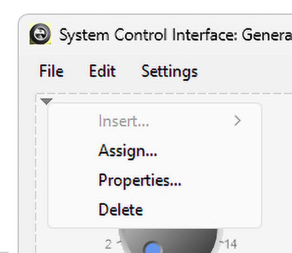W następnej kolejności należy powiązać manipulator z regulowanym parametrem. Po przypisaniu elementu zostaje udostępnione menu: przypisania (Assign), właściwości (Properities) oraz usunięcia (Delete) elementu manipulacyjnego (rysunek 8).