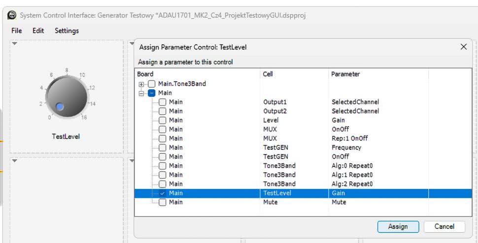 Kolejno musimy przypisać do elementu parametr, który będzie nim regulowany. W przypadku regulacji poziomu jest to parametr Gain z głównego schematu Main i elementu TestLevel. W przypadku schematów hierarchicznych każdy schemat ma parametry zgrupowane w rozwijanej liście o nawie zgodnej z nazwą schematu. Wybór parametru pokazano na rysunku 9. Pewnym problemem przy bardziej skomplikowanych blokach są braki w dokumentacji, zarówno jeżeli chodzi o opis parametrów, jak i ich regulowany zakres – wtedy niestety pozostaje metoda prób i błędów lub poszukiwanie w zasobach internetowych.
