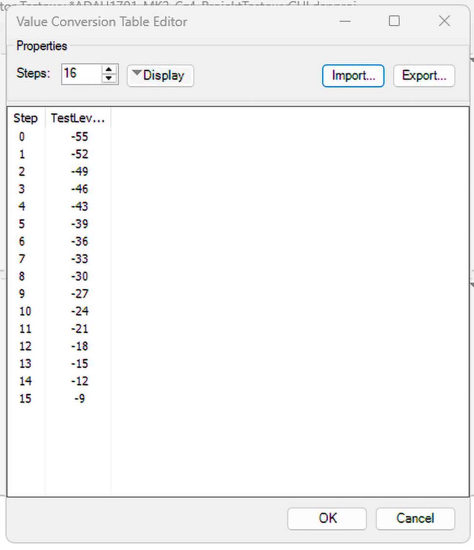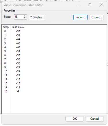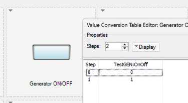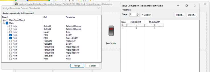 Ostatnią możliwością manipulacji parametrami generatora jest sterowanie multiplekserem przełączającym sygnał z wejścia analogowego lub z generatora. W tym celu do elementu typu przełącznik należy przypisać parametry: MUX:OnOff, MUX:Rep1 OnOff i określić „kroki” (stany) przełączania multipleksera, zgodnie z rysunkiem 13. Edytor Value Conversion Table editor umożliwia podstawową edycję zawartości komórek, dodawanie, usuwanie, kopiowanie i zmianę kolejności aktywnych kolumn. W celu aktywacji opcji edycji kolumn należy kliknąć prawym klawiszem myszki nagłówek z opisem kolumny.