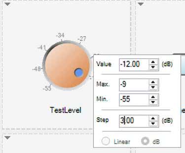 Jeżeli manipulator nie jest już potrzebny w interfejsie użytkownika, można usunąć go opcją Delete z menu podręcznego. Należy zwrócić uwagę na brak powiązania pomiędzy wartościami parametru w krokach regulacji a opisem w interfejsie użytkownika. Przykładowo poziom sygnału regulowany jest w zakresie od –55 dB do –9 dB w krokach 3 dB, a pokrętło ma domyślny opis w postaci numerów kroku 0...16. Należy to zmienić, klikając pokrętło lewym przyciskiem myszy i odpowiednio „synchronizując” zakres regulacji z opisem pokrętła – zgodnie z rysunkiem 11. W identyczny sposób definiowany jest element suwak (Slider), który stanowi po prostu zmienioną formę graficzną elementu pokrętła (Knob).