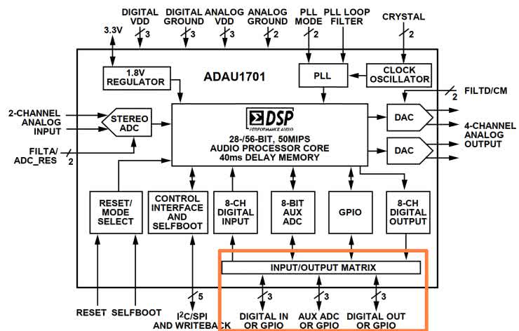Trzecią metodą wpływania na aplikację DSP jest użycie interfejsu GPIO. Procesor ADAU1701, którego schemat blokowy przypominamy na rysunku 15, wyposażony jest w programowalny interfejs GPIO, przeznaczony do współpracy z zewnętrznymi elementami manipulacyjnymi, takimi jak przełączniki, przyciski czy enkodery oraz elementami sygnalizującymi lub sterującymi. Wbudowany przetwornik A/D GPIO przeznaczony jest do obsługi potencjometrów lub analogowego sygnału sterującego. Umożliwia to prostą realizację interfejsów użytkownika w trybie pracy samodzielnej DSP, bez konieczności zastosowania zewnętrznego procesora sterującego.