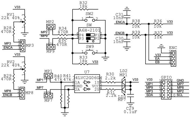 Interfejs GPIO składa się z dwunastu wyprowadzeń MP0...11, w tym czterech wejść analogowych MP2,3,7,8 o 8-bitowej rozdzielczości. Wyprowadzenia GPIO współdzielone są z cyfrowymi interfejsami szeregowymi audio, na co należy zwrócić uwagę podczas projektowania układu. Dla ułatwienia prototypowania płytka DSP1701A_DSP_MK2 wyposażona została w podstawowe elementy manipulacyjne podłączone do GPIO, zgodnie ze schematem z rysunku 16. Na płytce umieszczono dwa potencjometry, interfejs enkodera, dwa przyciski i przełącznik DIP oraz dwie buforowane diody LED. Każdy z elementów ma odpowiadającą zworę umożliwiającą odłączenie od wyprowadzenia GPIO, jeżeli jest ono używane do realizacji innej funkcji. Złącze GPIO umożliwia wyprowadzenie sygnałów MP1,2,3,7,8,9 wraz z zasilaniem 3,3 V do zewnętrznych układów współpracujących z DSP. Pozostałe wyprowadzenia GPIO, realizujące w DSP1701A_DSP_MK2 funkcję interfejsów cyfrowych audio, dostępne są na złączach I2SI, I2SO.