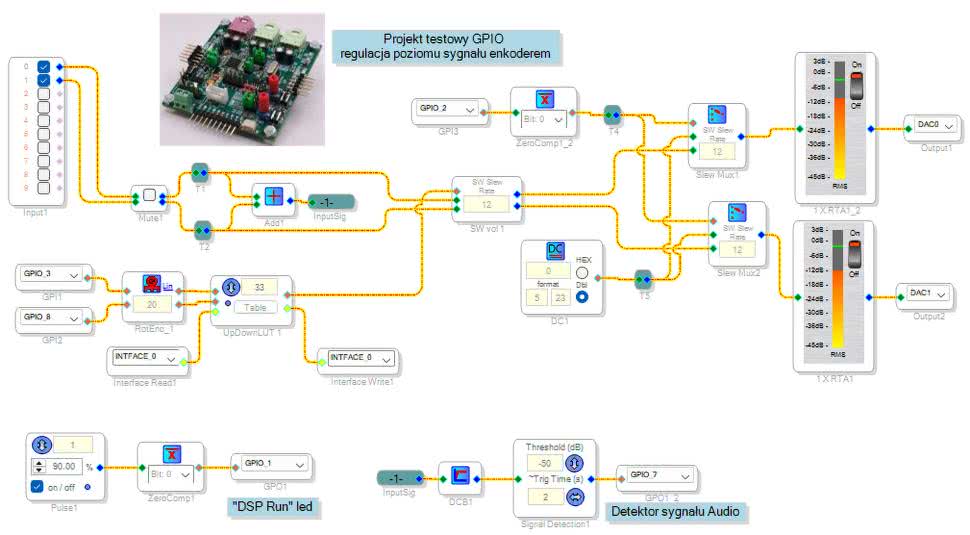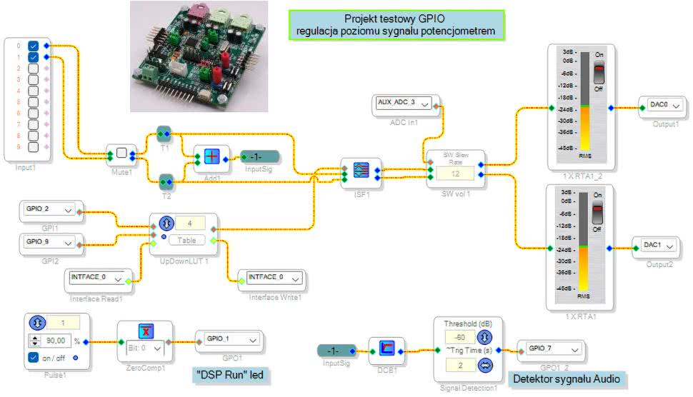 Obie metody wymagają stałej komunikacji płytki DSP1701A_DSP_MK2 ze środowiskiem SigmaStudio poprzez programator USBi, co w przypadku pracy samodzielnej procesora DSP jest niestety mało użyteczne. W tym przypadku niezbędne jest użycie metody trzeciej, czyli zmiany parametrów DSP poprzez wyprowadzenia GPIO i A/D za pomocą fizycznych przełączników, przycisków, potencjometrów lub enkoderów. W analogiczny sposób można sygnalizować wewnętrzny stan sygnału, np. za pomocą diod LED podłączonych do GPIO lub zastosować do sterowania układów zewnętrznych, takich jak multipleksery wejść, obwody stand-by, wyciszania itp.