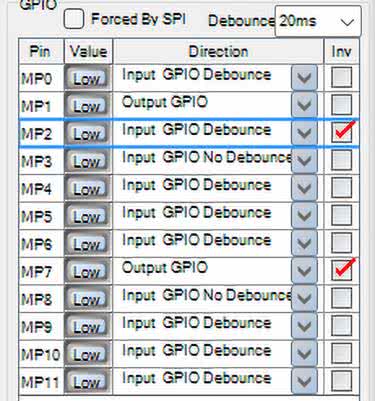 Wyprowadzenia GPIO, w trybie pracy w roli wejścia cyfrowego Input GPIO, mają wbudowany wewnętrzny rezystor podciągający o wartości około 15 kΩ. Podczas konfiguracji można aktywować wbudowany filtr eliminujący drgania styków Input GPIO Debounce, o czterech ustawianych czasach uśredniania (5, 10, 20, 40 ms) dla grupy wejść GPIO. Warto dodać, że wyprowadzenie MP8 ma błąd w implementacji sprzętowej i może zachowywać się nieprawidłowo (brak odczytu stanu wyprowadzenia), jeżeli skonfigurowane jest jako wejście z eliminacją drgań styku – niestety, nie ma możliwości rozwiązania problemu, więc linii tej należy używać w innej konfiguracji (np. do obsługi potencjometru). W trybie wyjścia cyfrowego możliwy jest wybór konfiguracji przeciwsobnej (Push-Pull Output GPIO) lub otwartego kolektora (OC Output GPIO Open Collector). Wydajność prądowa wyprowadzeń jest niewielka (do 2 mA), dlatego na płytce DSP1701A_DSP_MK2 – w roli buforów LED – zastosowano bramki z serii 1G06. Szeregowe rezystory 470 Ω, podłączone do elementów manipulacyjnych, chronią przed skutkami błędnej konfiguracji GPIO. Przy wykorzystaniu większej liczby wyjść należy pamiętać o sumarycznym pobieranym prądzie i każdorazowo zalecane jest użycie buforów lub pośredniego tranzystora sterującego. Napięcie doprowadzone do GPIO nie może przekraczać 3,3 V, także w przypadku wyjść OC (w ich przypadku może być jednak niższe, co ułatwia sprzęganie z układami zasilanymi np. napięciem 1,8 V czy 2,5 V, oczywiście z zewnętrznym rezystorem podciągającym).