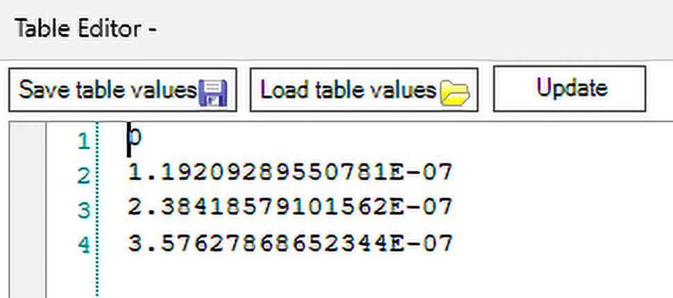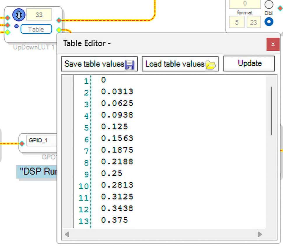 Stąd nieco nieintuicyjne – na pierwszy rzut oka – wartości. Wszystkie dane audio i większość parametrów są reprezentowane w DSP przy użyciu formatu dziesiętnego (5.23), zaś przeważająca liczba sygnałów związanych z interfejsem GPIO jest reprezentowana w formacie całkowitym (28.0), co podyktowane jest większym zakresem dopuszczalnych przyjmowanych wartości. W tabeli wartość indeksu jest reprezentowana w formacie całkowitym 28.0, podczas gdy dane wyjściowe mają format dziesiętny 5.23. Wprowadza to nieco zamieszania i na początku pracy z DSP jest częstą przyczyną problemów przy uruchamianiu aplikacji, gdyż część sterowanych zewnętrznie bloków akceptuje dane bezpośrednio w formacie 28.0 z interfejsu GPIO, a część wymaga przeliczenia do formatu 5.23. Dla „ułatwienia” kompilator nie ostrzega o niezgodnych formatach danych sterujących, więc poszukiwanie przyczyny nieprawidłowego (lub całkowitego braku) działania aplikacji bywa czasochłonne. W przypadku generowania danych w arkuszu kalkulacyjnym należy zwrócić szczególną uwagę na separator dziesiętny, który musi być kropką, a nie przecinkiem – inaczej dane zostaną zaimportowane bez ostrzeżenia, ale wartości nie będą prawidłowo sterowały blokami. Zawsze przy wczytywaniu danych z pliku do tabeli warto zweryfikować jej zawartość.