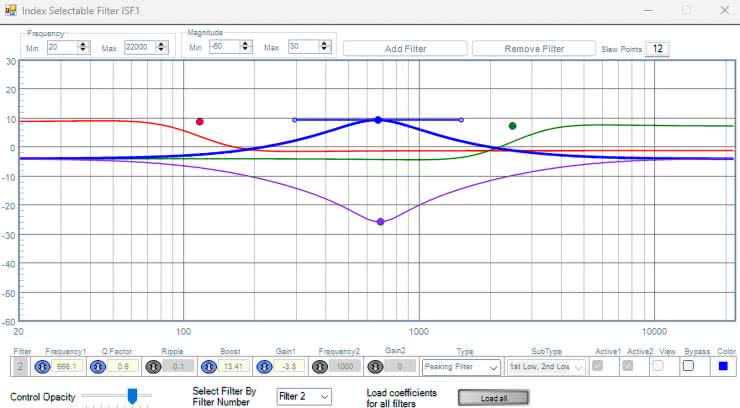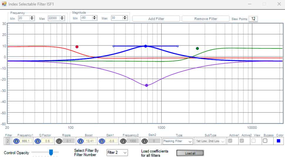Tor sygnałowy – podobnie jak w poprzedniej aplikacji – jest bardzo prosty. Sygnał z wejścia trafia do bloku konfigurowalnych filtrów General 2nd Order Index Selectable z biblioteki Filters, o wybieranej indeksem charakterystyce przenoszenia. Filtr skonfigurowany jest do wyboru czterech charakterystyk, zgodnie z rysunkiem 22. Następnie sygnał trafia do bloku regulacji poziomu, a stąd do wyjść przetwornika D/A. Pozostałe bloki pełnią funkcje identyczne jak w projekcie z enkoderem: dioda MP1 sygnalizuje aktywność DSP, dioda MP7 – obecność sygnału audio.