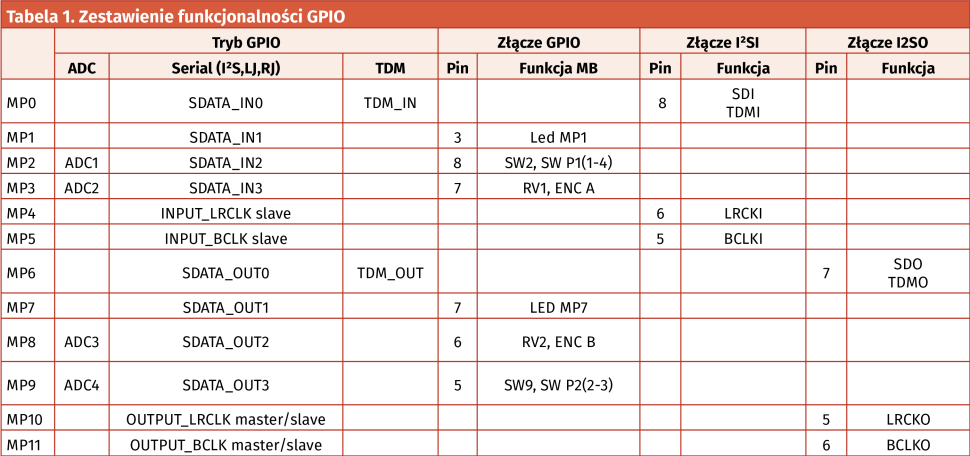 Wbudowany, pomocniczy przetwornik A/D ma 4 kanały o rozdzielczości 8 bitów, zakres napięć wejściowych to 0...3,0 V, co w przybliżeniu daje krok 12 mV/bit, przy rezystancji wejścia ok. 30 kΩ. Wejście ma charakterystykę liniową, najlepiej współpracuje z potencjometrem lub źródłem napięcia o liniowej charakterystyce zmian. Jeżeli wymagana jest zmiana charakterystyki regulacji, to powinna być ona realizowana na drodze programowej w DSP, np. przez tablice wartości LUT. Zapewni to najwyższą dokładność regulacji i pełne wykorzystanie rozdzielczości A/D. Interfejs GPIO domyślnie taktowany jest sygnałem fs, co nie znaczy, że należy używać go w roli przetwornika sygnału audio (uniemożliwia to zbyt mała rozdzielczość, a także brak połączenia z rdzeniem audio DSP). Jest to często spotykany błąd przy pierwszych projektach – A/D GPIO służy tylko i wyłącznie do podłączenia elementów manipulacyjnych, w żadnym przypadku do obsługi sygnału audio. Podczas projektowania własnego systemu istotne jest ponadto odpowiednie przyporządkowanie wyprowadzeń, szczególnie interfejsów cyfrowych, które „blokują” sporą część pinów GPIO – w tym AD – możliwą do wykorzystania przez interfejs użytkownika. Gdy aplikacja używa wszystkich pinów wyprowadzonych na złącze GPIO, nie ma przeciwwskazań do zastosowania pozostałych MPxx (wyprowadzonych na złącza I2SI, I2SO). Kompletne zestawienie funkcjonalności GPIO zebrano w tabeli 1.
