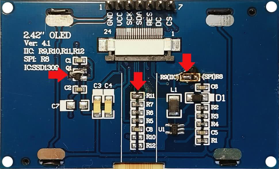 Na dolnej stronie płytki znajdują się wszystkie drobne elementy elektroniczne. Aby przerobić płytkę z interfejsu SPI na I²C, musimy najpierw wyjąć kabel wyświetlacza. W tym celu delikatnie przesuwamy szarą klamrę gniazda w kierunku środka płytki, po czym przewód możemy delikatnie wysunąć ze złącza. W pierwszej kolejności musimy odlutować rezystor R8 (0 Ω) i wlutować go w miejsce R9. Pola lutownicze są na tyle duże, że zamiast rezystora możemy umieścić tam kropelkę cyny. Podobnie robimy w miejscu R11.