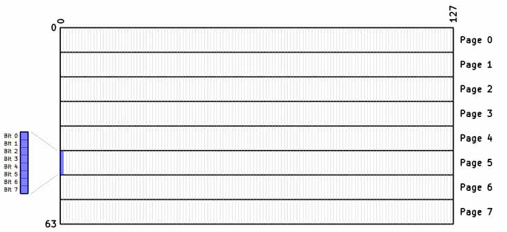 Ekran podzielono na osiem pasów o wysokości 8 pikseli. W dokumentacji SSD1309 pasy te nazywane są stronami (page). Wysokość 8 pikseli nie jest przypadkowa - dokładnie tyle bitów zawiera jeden bajt, czyli najmniejsza jednostka danych, jaką możemy przesłać przez interfejs I²C. A zatem przesyłając jeden bajt ustawiamy stan kolumny, złożonej z 8 pikseli. Kursor inkrementuje się automatycznie i przesuwa w prawo o jedną pozycję po odebraniu każdego bajtu danych.