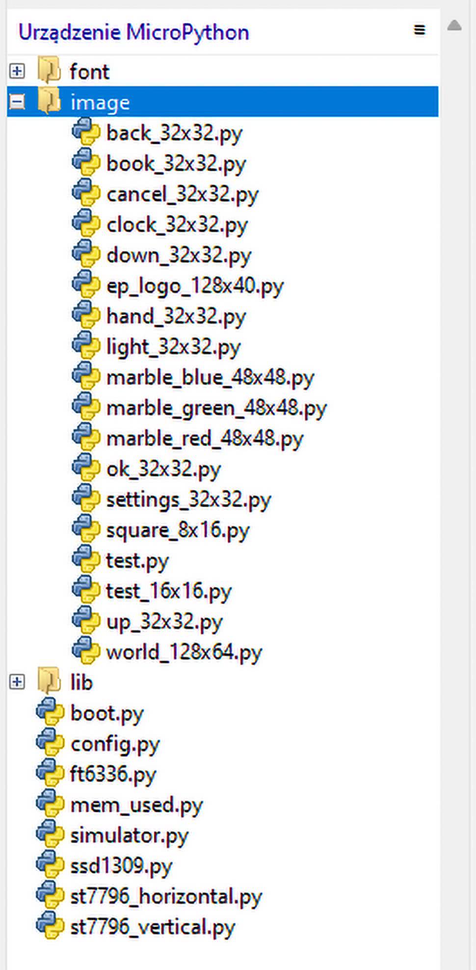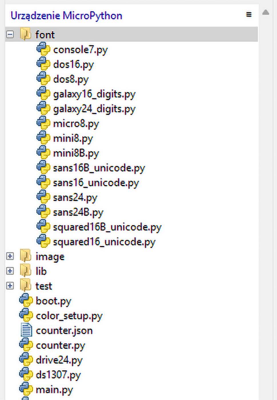 Ostatnim tematem do omówienia w niniejszym odcinku kursu jest wykorzystanie fontów innych niż te wbudowane w MicroPythona. W tym przypadku autorzy MicroPythona również nie dają żadnego wsparcia i wszystko musimy zrobić samodzielnie. Na potrzeby kursu udostępniam kilka moich autorskich fontów. Katalog font należy skopiować w całości do systemu plików MicroPythona, tak samo jak to robiliśmy w przypadku obrazów. Powinieneś widzieć go tak, jak pokazano na rysunku 5.